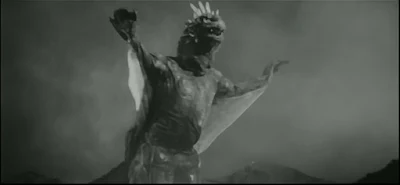 Alors les réponses sont simples et se trouvent dans Kaiju envahisseurs et apocalypse, merci à eux (je vous ai déjà parlé de ce livre ? Bon. Achetez-le) : les Ricains. Toujours dans les sales coups eux. En vrai à la base, ce projet devait être une coprod entre la Toho et American Broadcasting-Paramount Theatres (AB-PT Production pour les intimes - et qui deviendra plus tard en 1986 ABC Television) et devait proposer le premier kaiju entièrement destiné pour la télé. L'intrigue devait se découper en 3 épisodes, et la régression visuelle devient dés lors assez logique : il faut s'adapter au format des télévisions de l'époque, donc tourner en noir et blanc et en 1:33. Seulement pas de bol, alors que les Japonais sont en plein tournage, AB-PT Production se rétracte - faisons simple - et laisse les Japonais mais alors comme des cons. Les 3 épisodes sont mixés en une seule histoire, la Toho converti le 1:33 en 2:35 (le fameux Toho Pan Scope - dégueulasse, si je peux me permettre) et le film sort au ciné.
